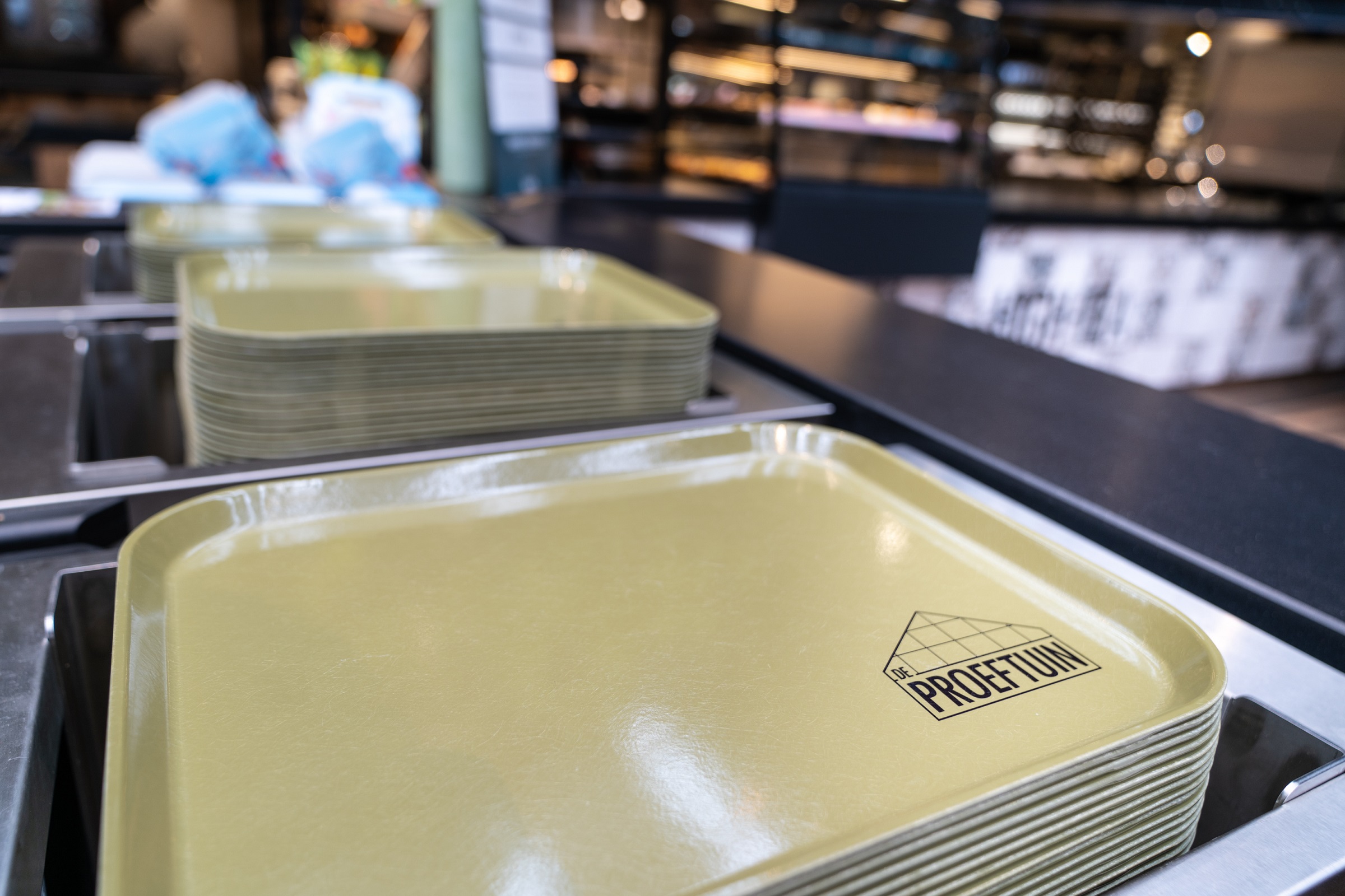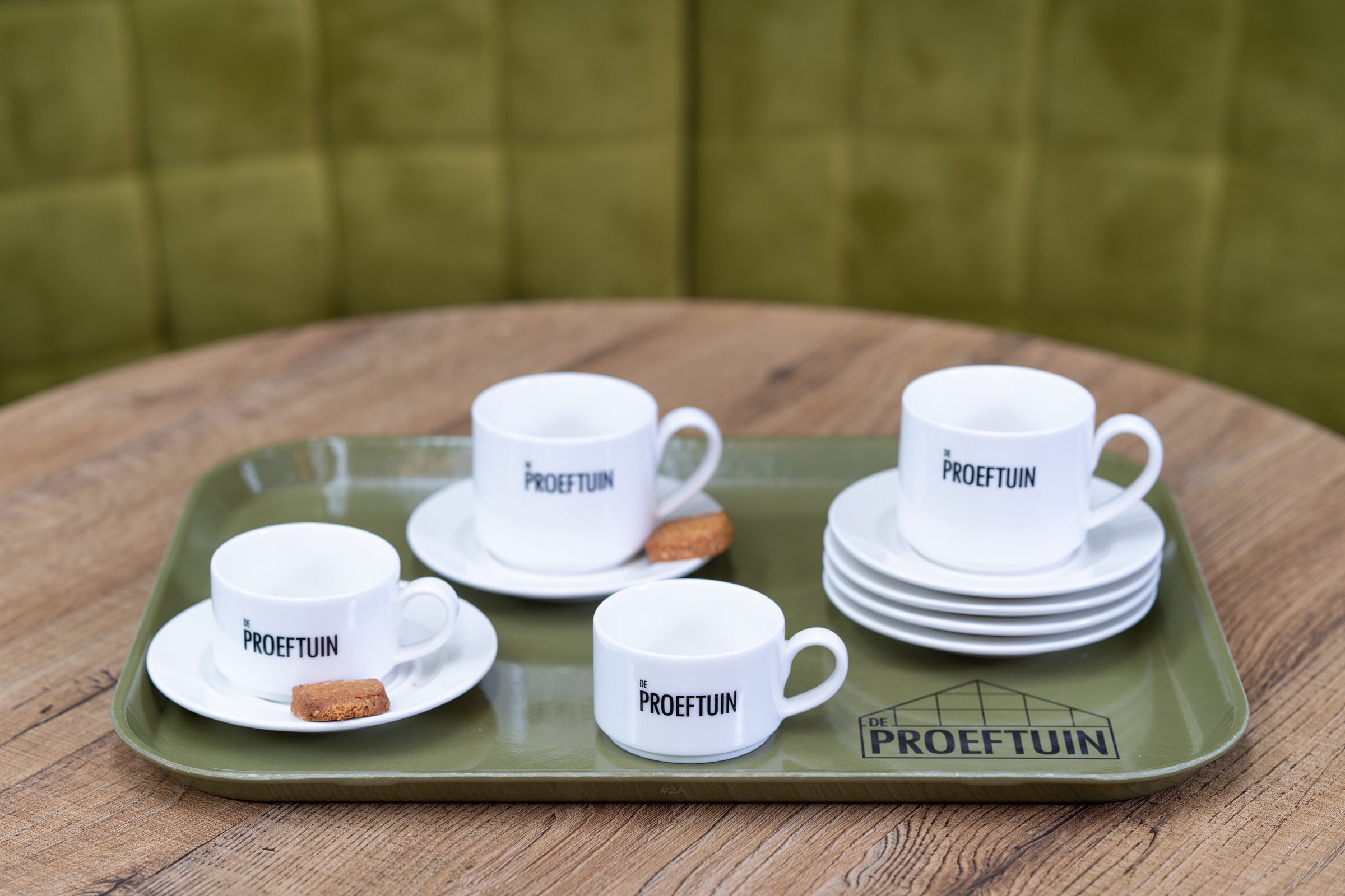 Ik ben vanaf het begin bij de ontwikkeling van De Proeftuin betrokken en dus ook bij de inrichting van keuken en restaurants. We zochten duizend dienbladen met logo en tienduizend kopjes in vijf soorten. Dan moet je dus ook een partij hebben die dat kan handlen. Er kwam al snel een bepaald soort servies bovendrijven dat we mooi vonden maar de betreffende partij kon niet dat volledige assortiment op tijd leveren.