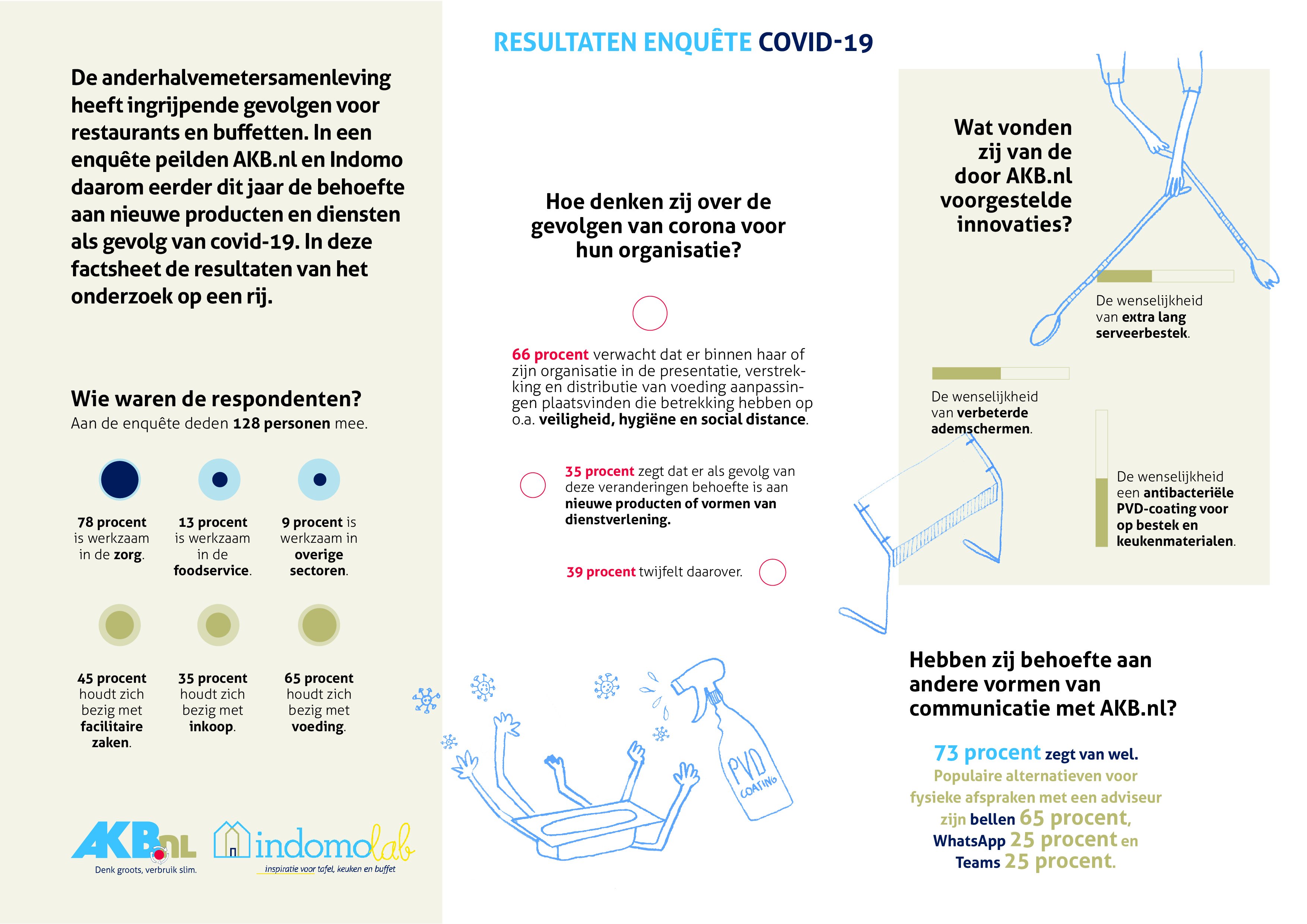 Op de enquête van AKB.nl en Indomo reageerden in totaal 128 respondenten, van wie een overgrote meerderheid in de zorg werkt (78 procent) en een kleiner deel in de foodservice (13 procent). 9 procent is afkomstig uit andere sectoren. Van alle respondenten houdt 65 procent zich met voeding bezig, 45 procent met facilitaire zaken en 35 procent met inkoop. Een beknopt overzicht van de resultaten levert deze infographic.